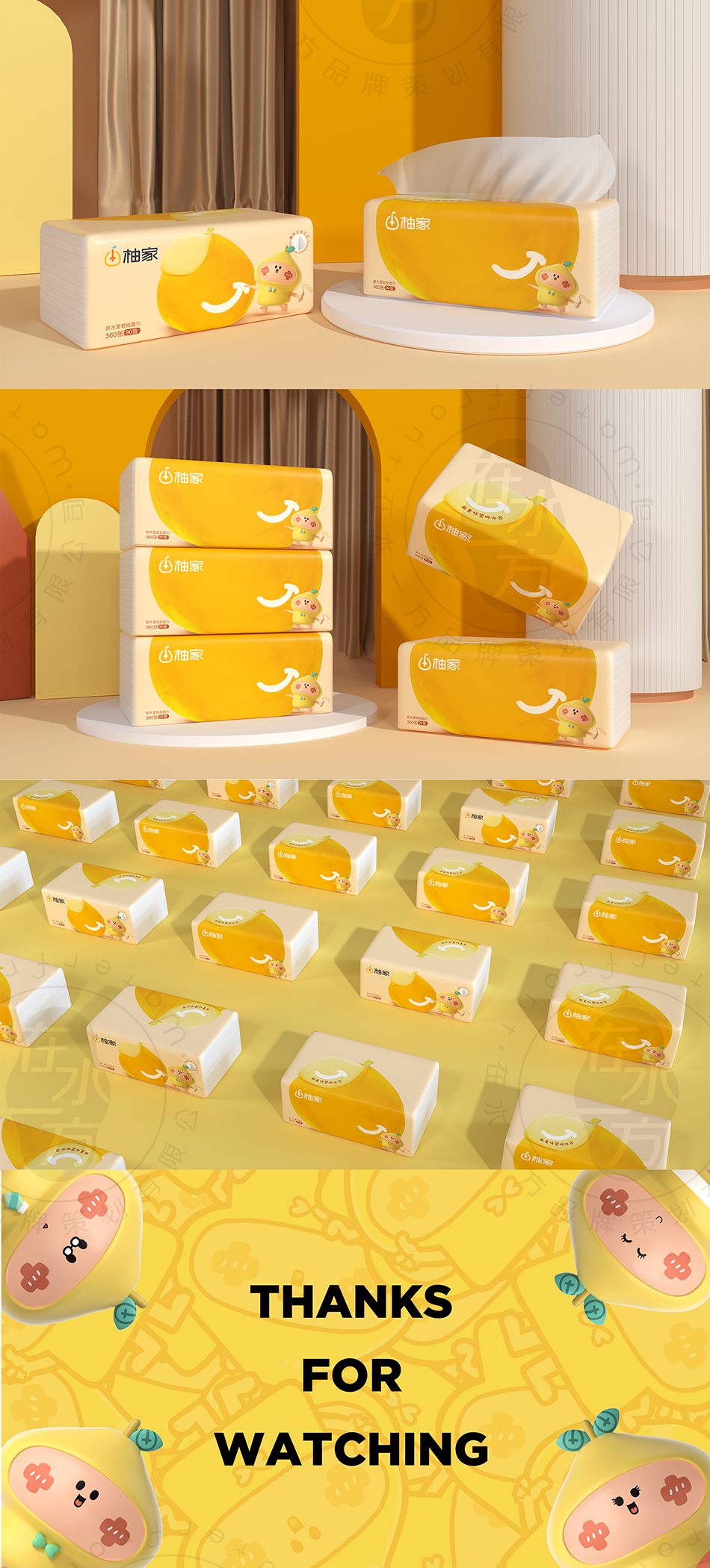 服務(wù)方案:進(jìn)入2.0時(shí)代的柚家,擁有更為明確的品牌定位路線,以迎合精致家居消費(fèi)為導(dǎo)向,全力推出一系列符合新消費(fèi)市場的優(yōu)質(zhì)紙品。放大“家”的概念,引進(jìn)柚子家族IP形象詮釋品牌對(duì)潔居生活的理解,用更為時(shí)尚有趣的方式展現(xiàn)健康品質(zhì),有助于品牌順利出圈。