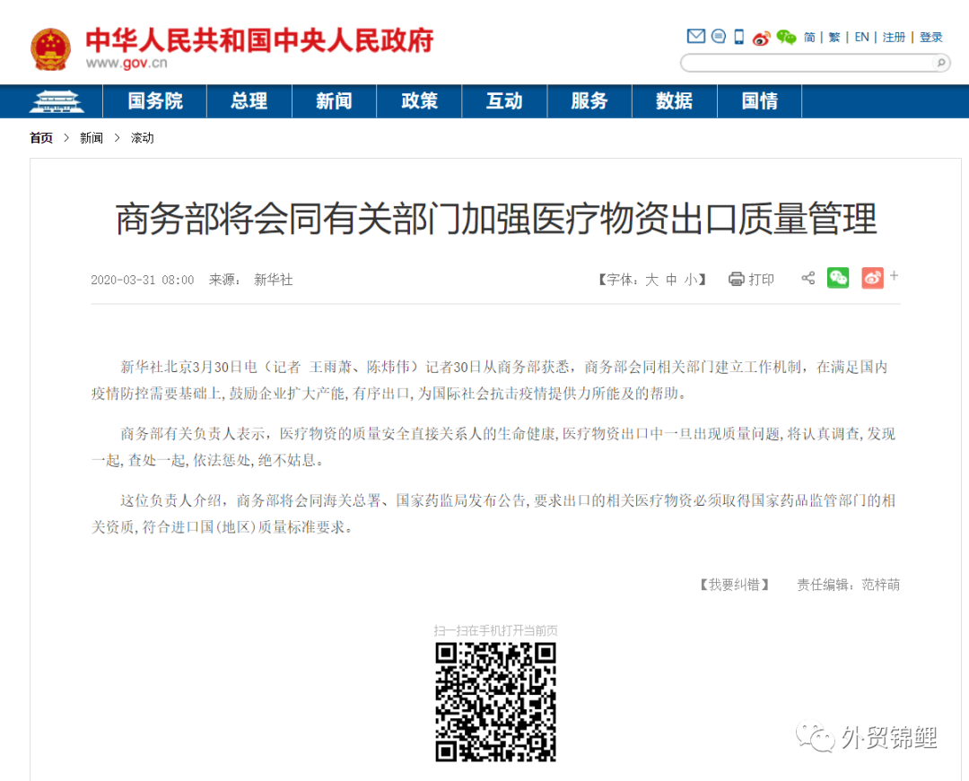 鑒于以上種種情況,商貿部為了規(guī)范醫(yī)療產(chǎn)品行業(yè),尤以口罩產(chǎn)品為主,已經(jīng)宣布對當前醫(yī)療物資出口增加必要的超常規(guī)管理,督促企業(yè)以更加負責任的態(tài)度接單生產(chǎn)并出口。