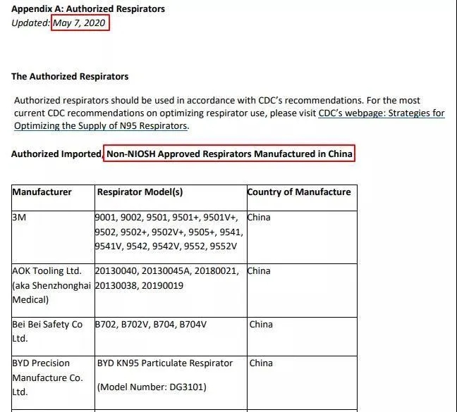 5月7日,美國FDA更新了針對中國生產(chǎn)的未獲NIOSH認(rèn)證的口罩獲得EUA授權(quán)的文件,獲得FDA認(rèn)可的中國生產(chǎn)的非NIOSH認(rèn)證的口罩只剩下14個(gè)廠家。