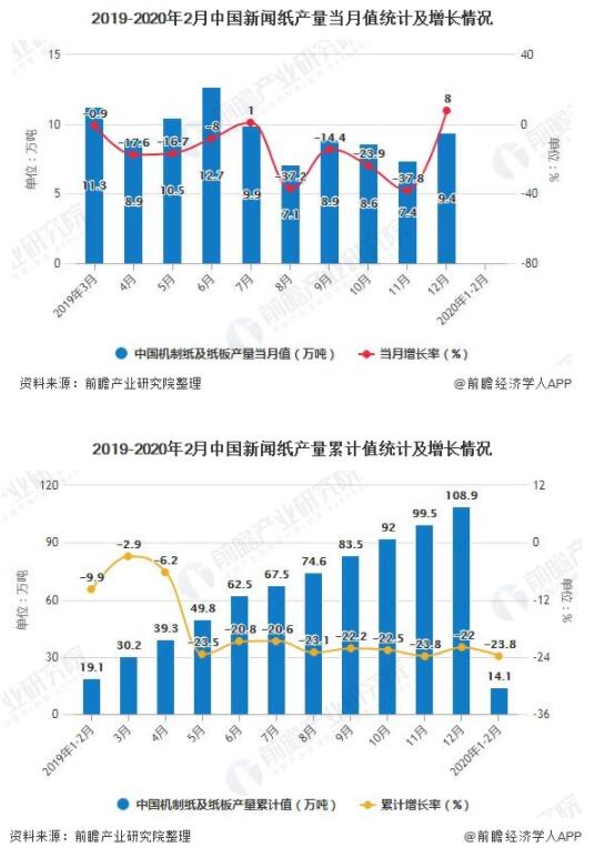據(jù)國家統(tǒng)計局?jǐn)?shù)據(jù)顯示,2019年全年中國新聞紙產(chǎn)量達到了108.85萬噸,累計下降22%。截止至2020年1-2月中國新聞紙產(chǎn)量達到14.1萬噸,累計下降23.8%。