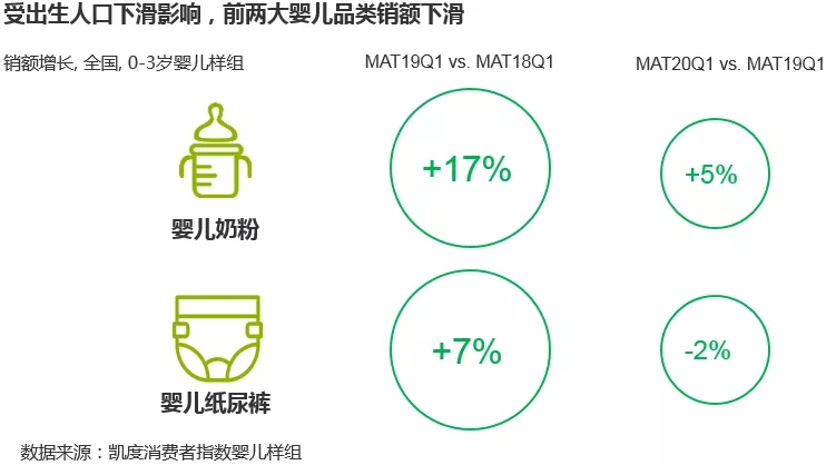 受到新生人口減少的影響,母嬰市場兩大頭部品類——奶粉和紙尿褲增長開始放緩。凱度消費(fèi)者指數(shù)顯示,2019年一季度嬰兒紙尿褲銷售額同比增長7%,但2020年一季度同比下滑了2%,這一部分下跌與年初的疫情事實(shí)上關(guān)系不大。多位資深從業(yè)者表示,即便身處動(dòng)蕩的疫情環(huán)境下,消費(fèi)者對于奶粉、紙尿褲這樣的剛需產(chǎn)品的投入絲毫不會(huì)吝嗇。