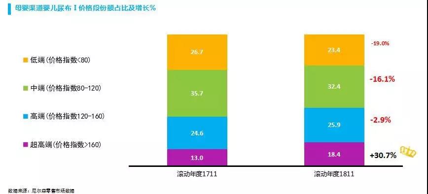 2018年紙尿褲市場最明顯的變化是,多年來固化的內(nèi)外資品牌格局正在被打破,從花王、好奇、幫寶適、尤妮佳、大王為代表的外資大牌紙尿褲發(fā)展態(tài)勢來看,花王和好奇紙尿褲在大幅下滑,尤妮佳開始超越花王,幫寶適借一級幫觸底反彈,大王紙尿褲正處上升盛世,不過增長壓力、控價壓力越來越大。與此同時,高端紙尿褲市場出現(xiàn)突破機(jī)會。從尼爾森零售市場數(shù)據(jù)來看,2018年160元以上超高端價位的紙尿褲銷售額增長超30%,對比鮮明的是,中低端紙尿褲市場下滑嚴(yán)重。目前紙尿褲市場中,進(jìn)口有機(jī)材質(zhì)、日夜用等細(xì)分概念,以及適合寶寶運(yùn)動的拉拉褲在引領(lǐng)行業(yè)增長,尤其是三四線城市增長迅速。