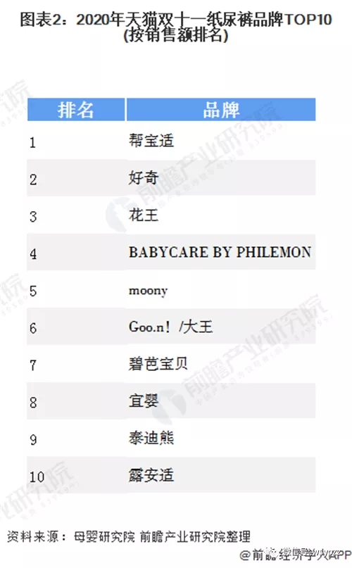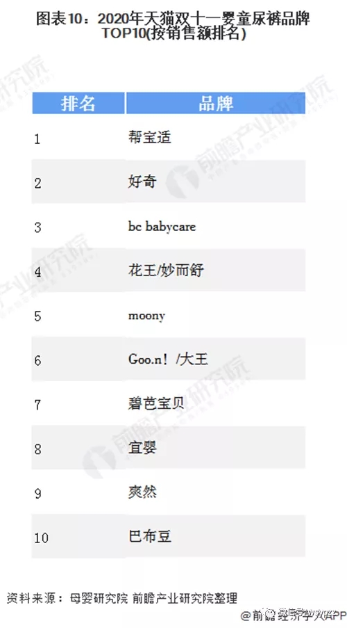 作為母嬰領(lǐng)域剛需、高頻的消費(fèi)類目,紙尿褲需求量巨大,由于父母對(duì)于嬰幼兒健康愈發(fā)重視,消費(fèi)者對(duì)于紙尿褲的品牌同樣重視。2020年天貓雙十一嬰童尿褲品牌TOP10中,幫寶適毫不疑問(wèn)依然位居首位。