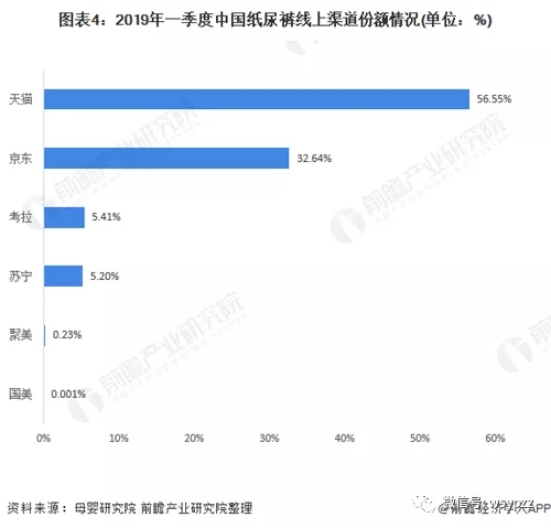 可見(jiàn),線上渠道是紙尿褲銷售的重要渠道。2019年第一季度,紙尿褲銷售額達(dá)48.1億元,同比增長(zhǎng)12.6%。其中天貓平臺(tái)保持其“一哥”優(yōu)勢(shì),銷售額27.2億元,占比56.5%。京東平臺(tái)銷售額15.7億元,占比32.6%,同比增長(zhǎng)6.1%。在增長(zhǎng)率上,考拉出現(xiàn)了20.2%的負(fù)增長(zhǎng),蘇寧實(shí)現(xiàn)了214.8%的超高速增長(zhǎng)。.jpg)