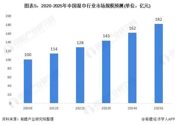 另一方面,2019年底全國疫情的爆發(fā)極大地刺激了濕巾的消費需求。2020年1-5月,阿里濕巾線上銷售額均在1億元左右,2020年4月銷售額更是高達1.32億元,2020年2月環(huán)比增速達到113.63%。此次“新冠疫情”較2003年非典更加嚴重,進一步激化了國人對衛(wèi)生健康的關注。同時,隨著我國經濟積極向好,居民消費能力及意愿不斷提升,企業(yè)不斷探索制造多元化的濕巾,后疫情時代我國濕巾行業(yè)發(fā)展前景更為明朗,預計2025年市場規(guī)模有望達到182億元。