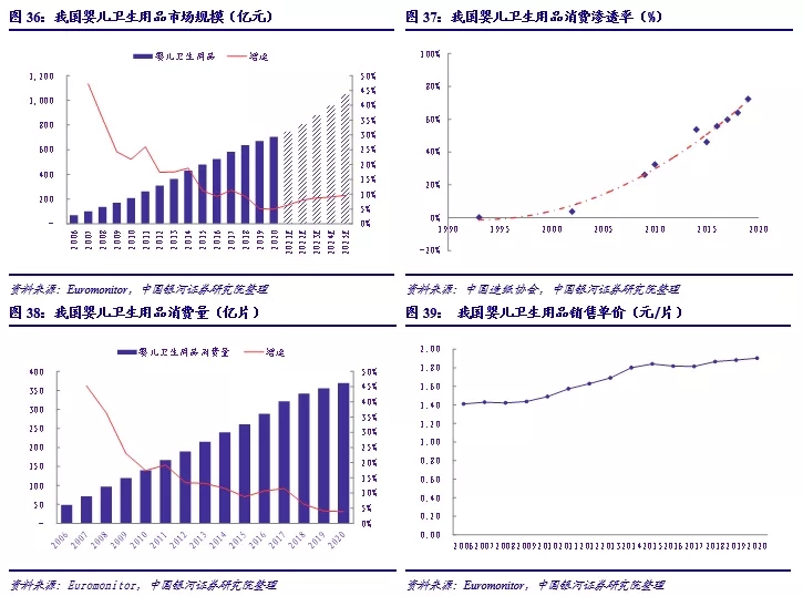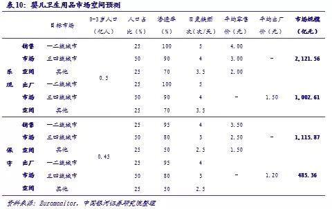 考慮到滲透率、日均使用量以及產(chǎn)品價格帶多種因素的差異,我們同樣按照不同地區(qū)劃分對嬰兒衛(wèi)生用品市場規(guī)模進行了預測。其中因為0-3歲區(qū)間內(nèi)不同年齡段嬰兒的日均更換頻次不同,預測中進行了取均數(shù)處理,通常新生兒每日應該更換6-8次,隨著年齡的增長時間間隔可以逐步拉長。綜上,我們樂觀預期我國嬰兒衛(wèi)生用品的終端市場規(guī)模約2100億元,保守也可達到1100億元,較20年市場規(guī)模有60%-200%的提升空間;出廠價按照樂觀1.50元/片、保守1.20元/片的行情預測,出廠市場規(guī)模也可達到490-1000億元。