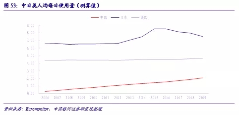 3.人均使用量的提升。伴隨著衛(wèi)生意識的提高,消費升級趨勢以及嬰兒衛(wèi)生用品新產(chǎn)品的更新?lián)Q代,家長們會更加注重紙尿褲安全性與舒適感,不斷提高使用更換頻次。根據(jù)測算,日本市場出現(xiàn)波動前每個適齡嬰幼兒(0-3歲)的每日使用量約為6.5片,美國市場的長期均值水平為4.5片/日;對比之下,盡管出現(xiàn)提升趨勢,我國當前的人均使用量為2片/日,較發(fā)達成熟市場存在較大差距,未來有望進一步提升至4-6片/日的區(qū)間內(nèi)。
