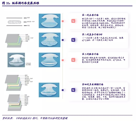 自香港的瑞德國際旗下品牌Fitti菲比(1992年),以及金佰利旗下品牌好奇(1994年)進入中國大陸市場,我國嬰兒衛(wèi)生用品行業(yè)經(jīng)歷了快速發(fā)展,產(chǎn)品在材質(zhì)、結構等層面不斷迭代更新。行業(yè)整體與其核心——芯體的發(fā)展歷程相近,以2006年為階段性節(jié)點,在此之前,我國的嬰兒衛(wèi)生用品行業(yè)以外資品牌為主,好奇、幫寶適、媽咪寶貝等國際品牌集中進入中國市場,產(chǎn)品芯體雖有結構分區(qū)的變化,但以絨毛漿和SAP材質(zhì)為主導;2006年不含絨毛漿的復合芯體結構出現(xiàn),此后國內(nèi)品牌大舉擴張,市場內(nèi)多品牌混戰(zhàn)。