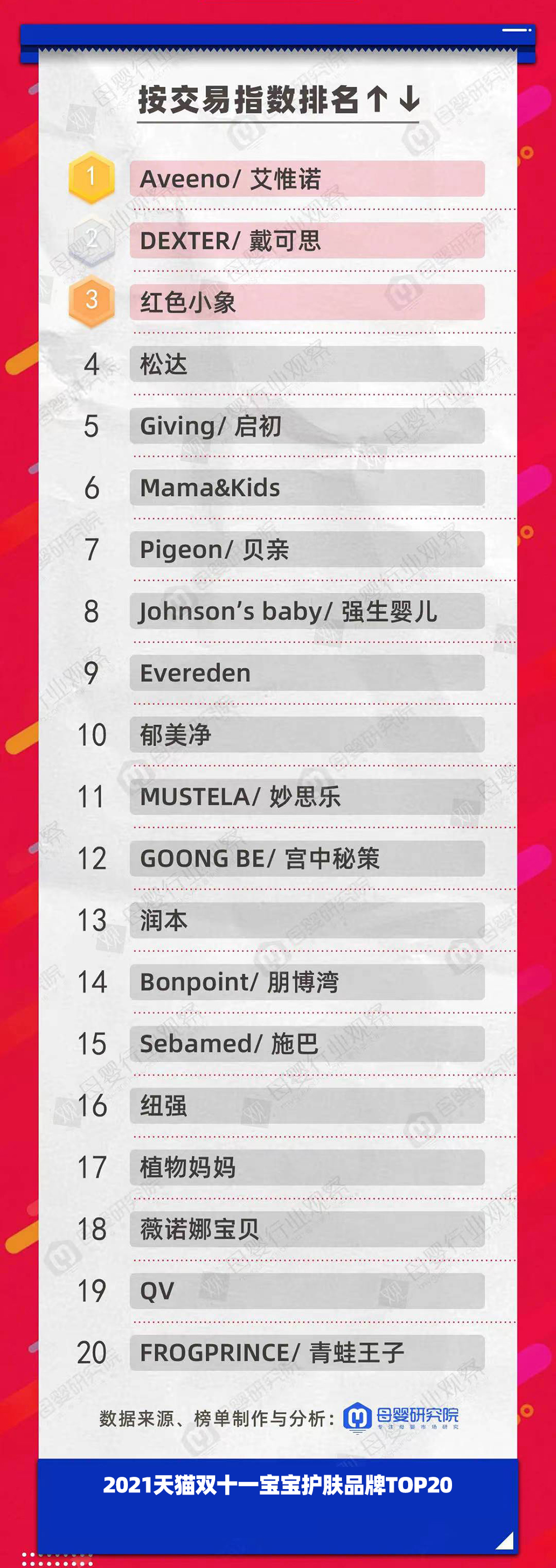 寶寶護(hù)膚品牌的Aveeno艾維諾、DEXTER戴可思以及紅色小象問(wèn)鼎品類TOP3。上一年度雙11的品類前三分別為Aveeno艾維諾、紅色小象和松達(dá)。