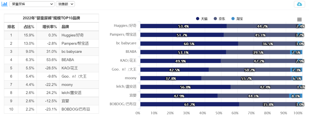 按照市場(chǎng)規(guī)模來看,2022年嬰童尿褲TOP10品牌分別為好奇、幫寶適、Babycare、碧芭寶貝(Beaba: )、花王、大王、Moony、露安適、宜嬰、巴布豆。