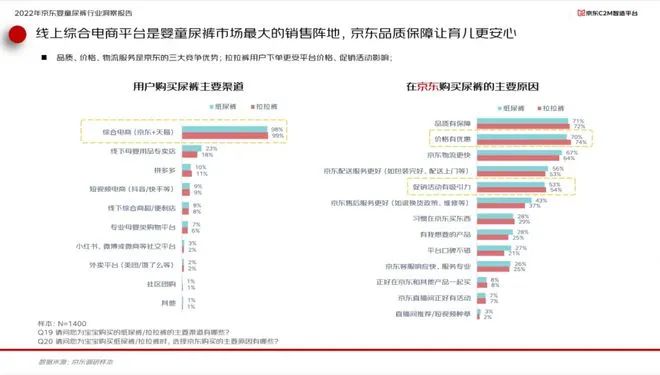 報(bào)告顯示,2022年中國嬰童尿褲市場(chǎng)渠道分布上,線上渠道占比已經(jīng)超過線下渠道達(dá)到52%,而以京東為代表的綜合類電商是嬰童尿褲消費(fèi)者最主要的線上購物渠道。