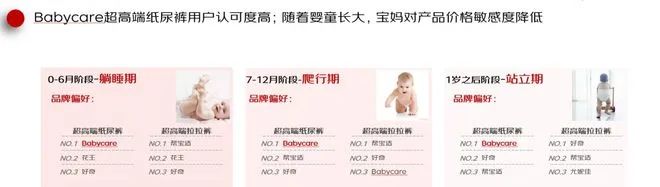報(bào)告還對(duì)國產(chǎn)母嬰用品品牌Babycare進(jìn)行了解析,發(fā)現(xiàn)該品牌的超高端紙尿褲用戶認(rèn)可度高,無論是0-6個(gè)月,還是7-12個(gè)月,以及1歲之后階段,Babycare超高端紙尿褲都是用戶品牌偏好榜首。而且隨著嬰童長(zhǎng)大,寶媽對(duì)產(chǎn)品價(jià)格敏感度降低,Babycare超高端紙尿褲成為了諸多寶媽的首選產(chǎn)品。
