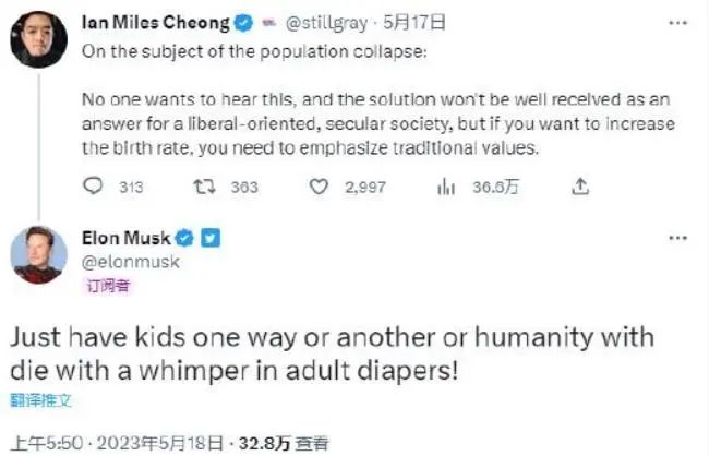 據(jù)財聯(lián)社報道,馬斯克近兩年頻繁就全球人口減少的問題多次發(fā)出警告,日前他又再度“催生”。馬斯克在一則推文中強(qiáng)調(diào)在出生率下降的情況下迫切需要采取行動,以及若不作為,人類未來所面臨的潛在后果。#馬斯克再敲人口警鐘#