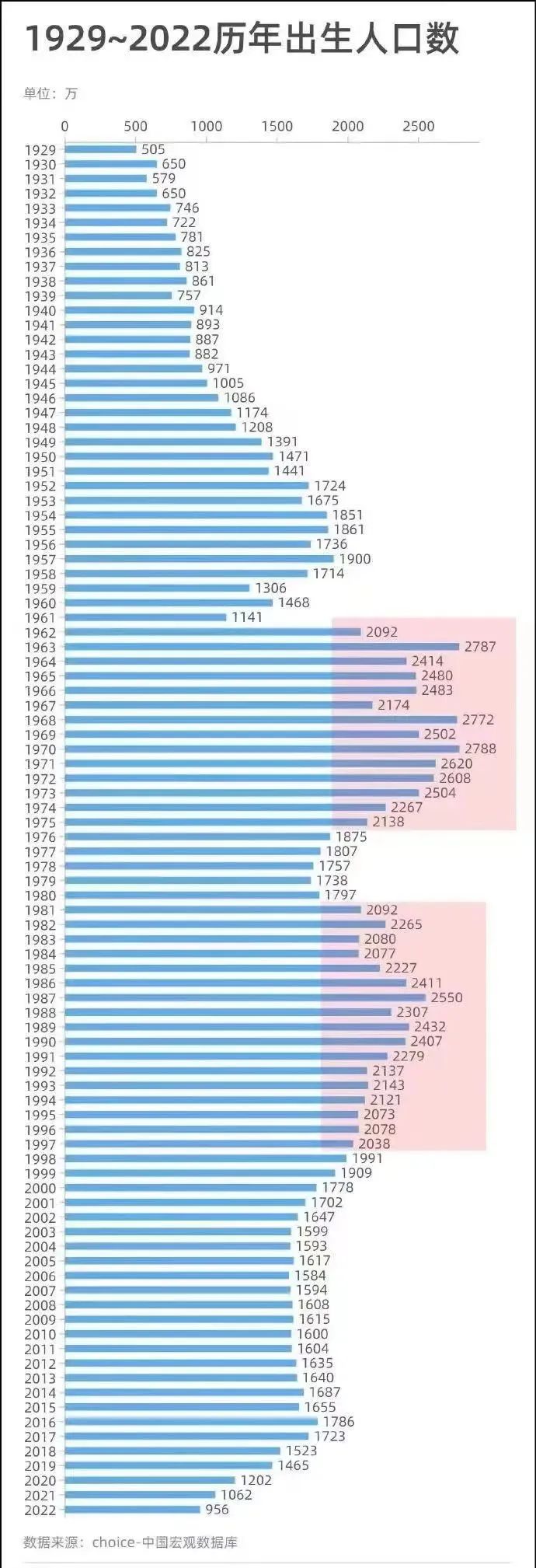 中國歷年出生人口變化(1929-2022):1970年最高2788萬,2022年全國人口出生僅為956萬,創(chuàng)下了有數(shù)據(jù)記錄以來的歷史新低。下圖是1929-2022年人口出生數(shù):
