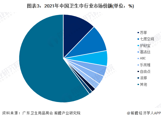 數(shù)據(jù)顯示,2021年中國衛(wèi)生巾行業(yè)市場份額前三的品牌分別是蘇菲、七度空間以及護(hù)舒寶,市場份額分別為12%、10%和6%。衛(wèi)生巾行業(yè)品牌數(shù)量眾多,頭部品牌市場份額相對較小。