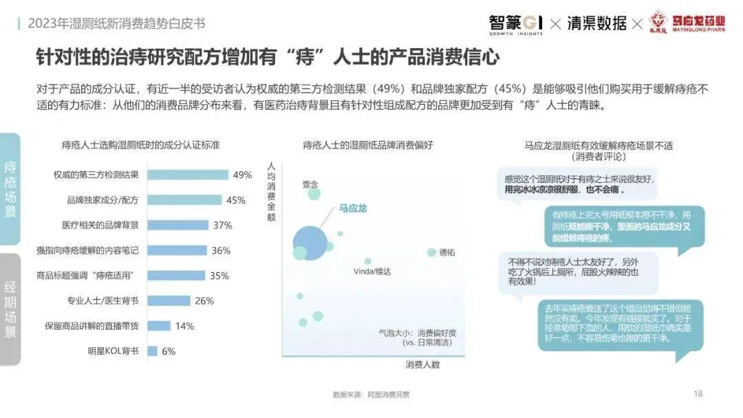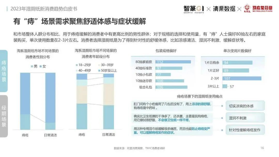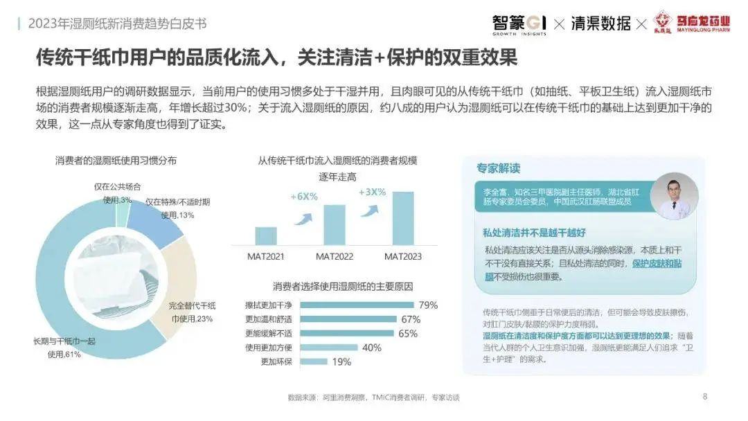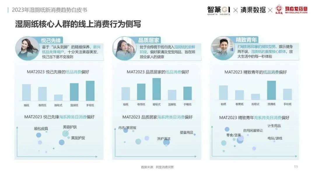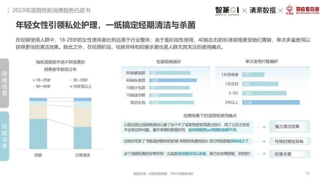 淘系濕廁紙品類(lèi)近三年的消費(fèi)金額持續(xù)增長(zhǎng),增幅遠(yuǎn)超衛(wèi)生用紙整體市場(chǎng),其中,天貓官旗的消費(fèi)責(zé)獻(xiàn)占主陣地,MAT2023占淘系年度消費(fèi)的六成以上,市場(chǎng)規(guī)模的擴(kuò)張主要來(lái)自消費(fèi)人數(shù)的增長(zhǎng),有越來(lái)越多的新客涌入,共同推動(dòng)溫廁紙的全民風(fēng)潮,同時(shí),消費(fèi)者的使用習(xí)慣養(yǎng)成,復(fù)購(gòu)意愿顯現(xiàn),消費(fèi)頻次也達(dá)到衛(wèi)生用紙整體的增速。